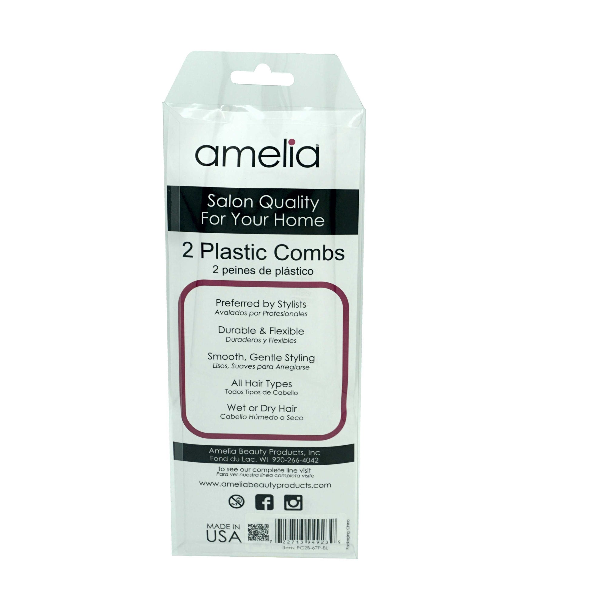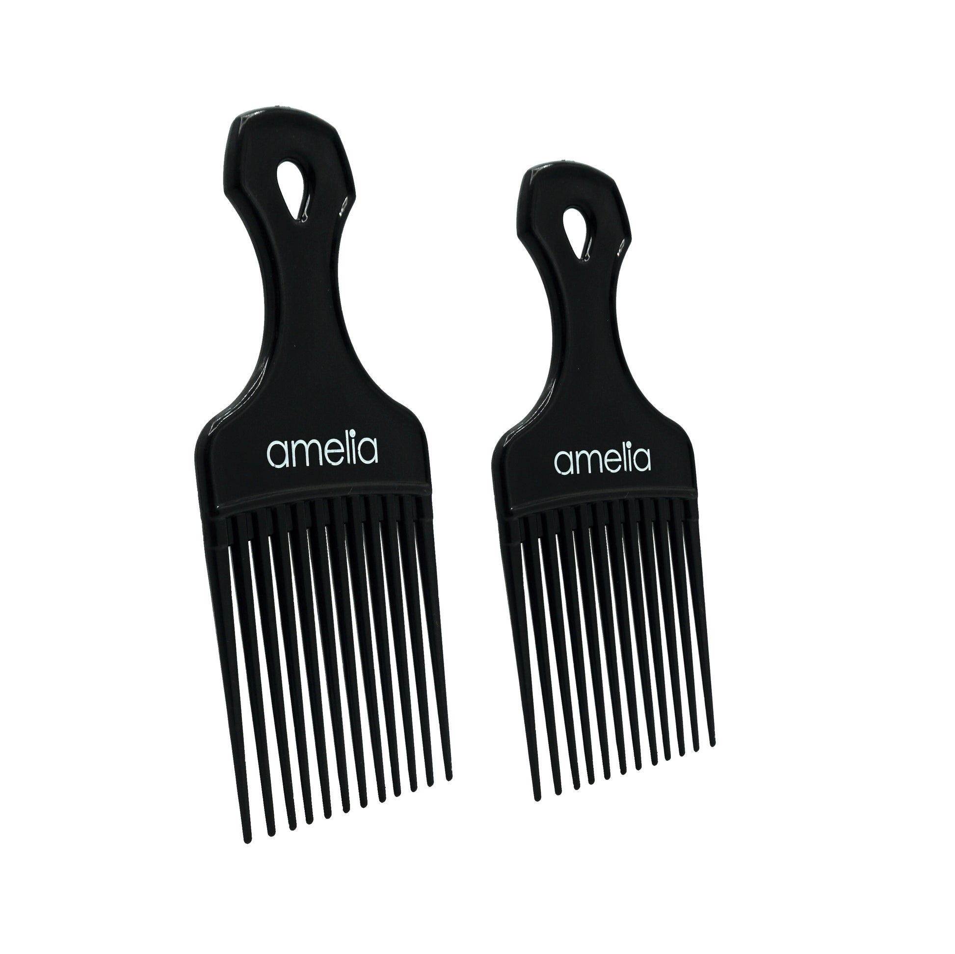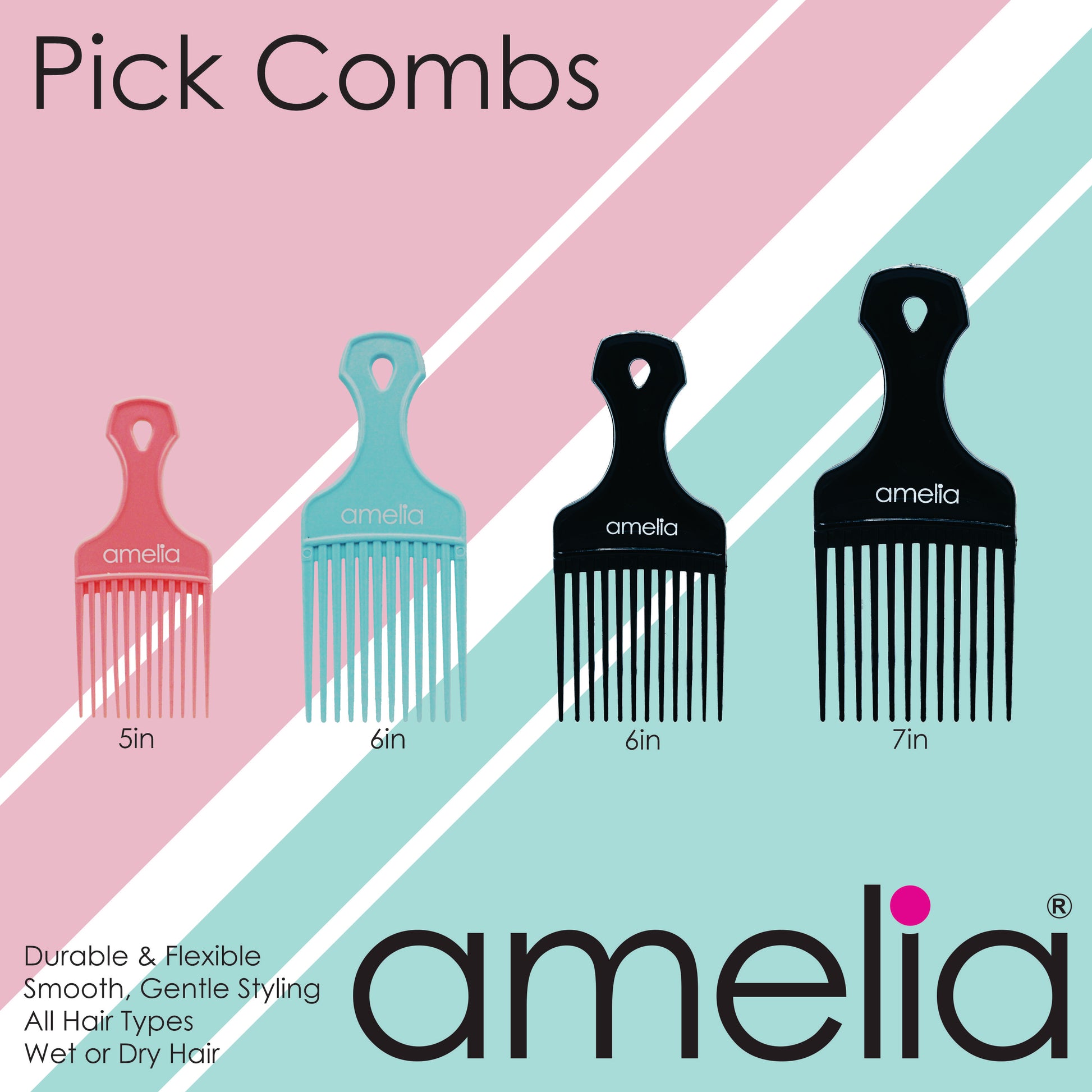 Amelia Beauty Curly 6in and 7in Black Wide Tooth Pick Comb Combo Package. Made in USA. Professional Grade Hair Pick For All Hair Types and Ages. Smooth and Comfortable Seamless Design is Gentile on Hair and Does Pull or Damage Hair. Creates Volume, Detangles, Portable Salon Barber Shop Black Afro Pick Comb Hair Styling Tool. Wet or Dry Use, Dimensions 7" x 3" and 6" x2.5". Multi Combo Pack of 2 Combs peine de plástico para el cabello