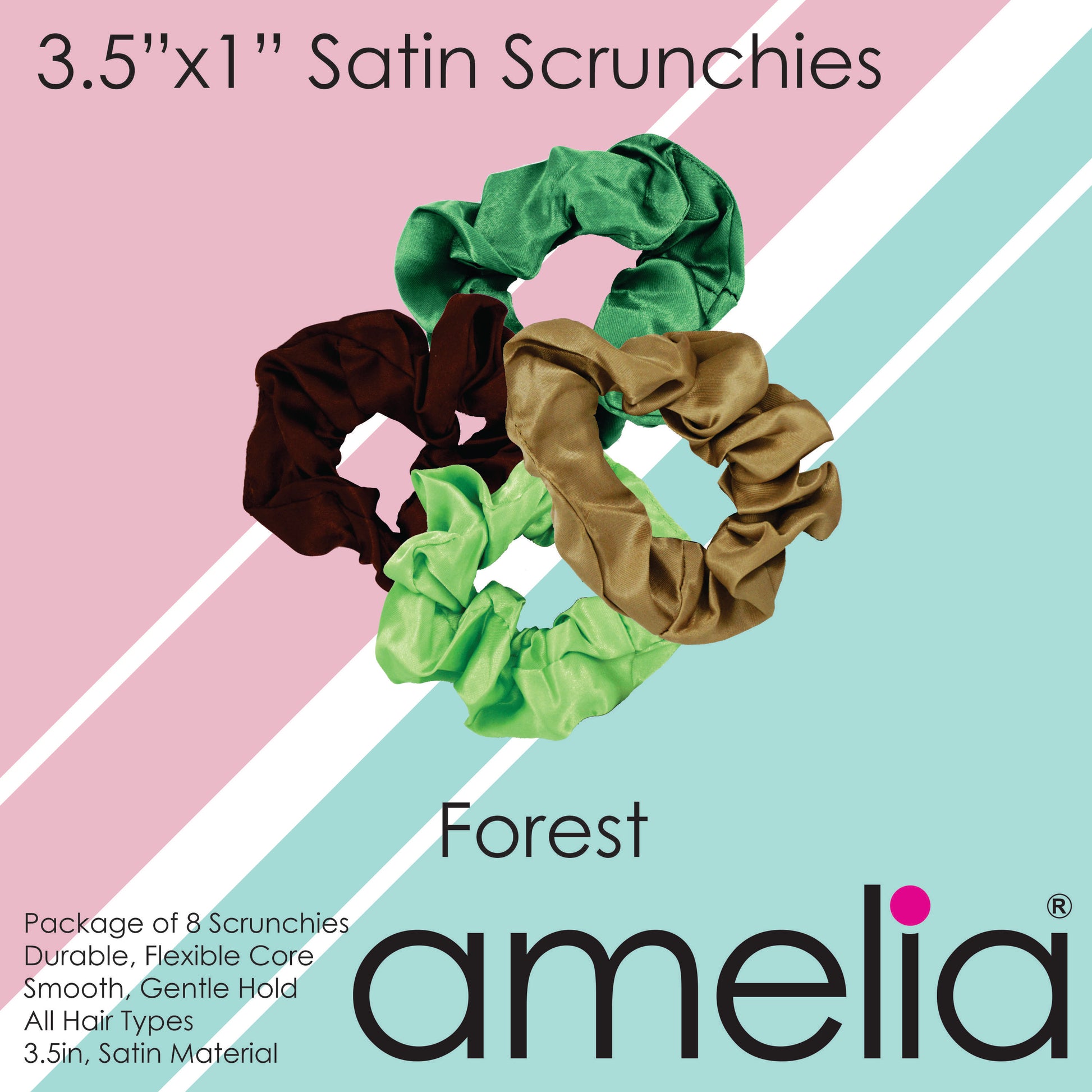 Amelia Beauty Products, Forest Blend Satin Scrunchies, 3.5in Diameter, Gentle on Hair, Strong Hold, No Snag, No Dents or Creases. 8 Pack