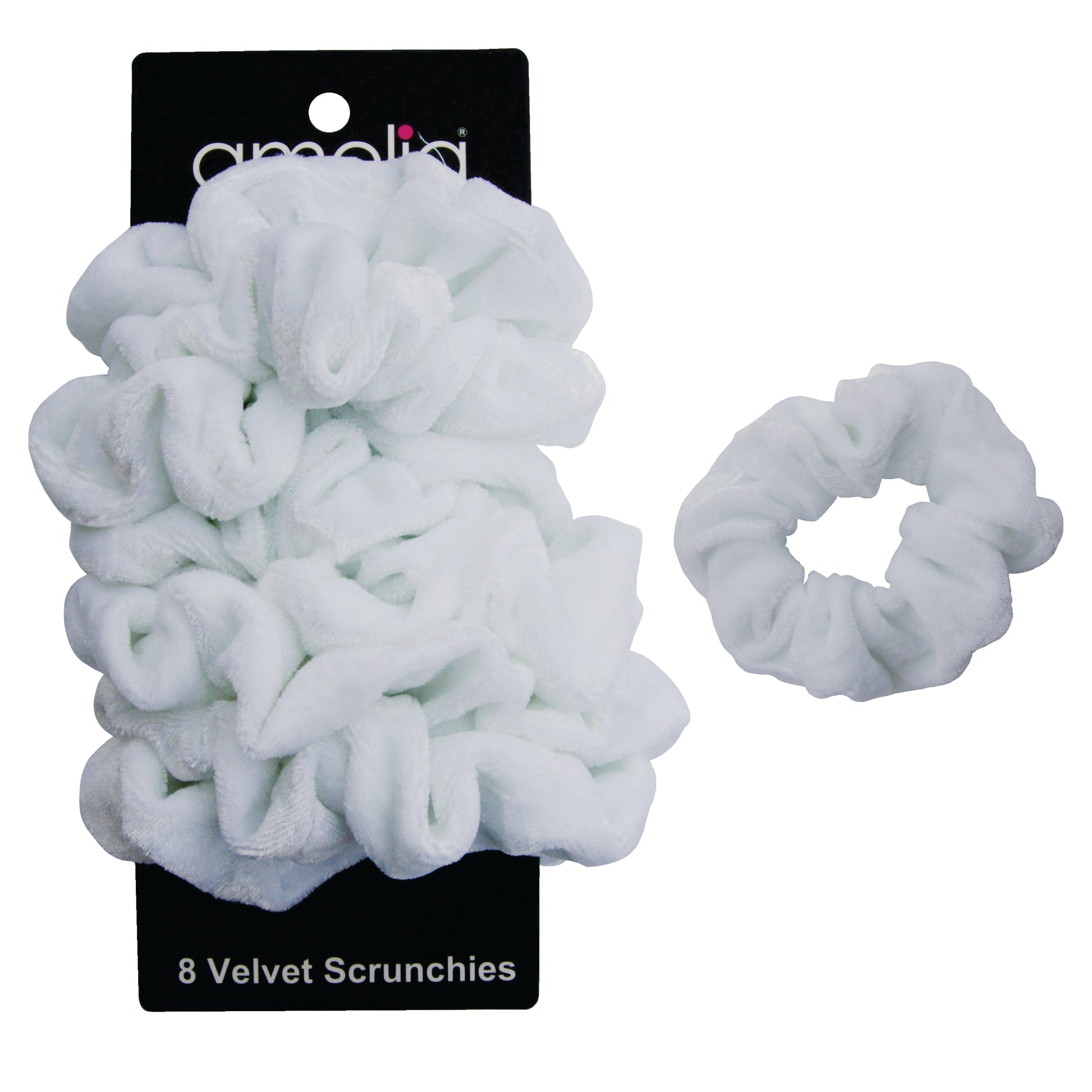 Amelia Beauty, White Velvet Scrunchies, 3.5in Diameter, Gentle on Hair, Strong Hold, No Snag, No Dents or Creases. 8 Pack