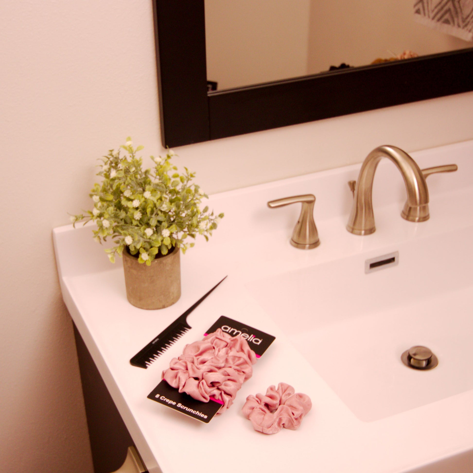 Amelia Beauty | 3in Pink Crepe Scrunchies | Soft, Gentle and Strong Hold | No Snag, No Dents or Creases | 8 Pack