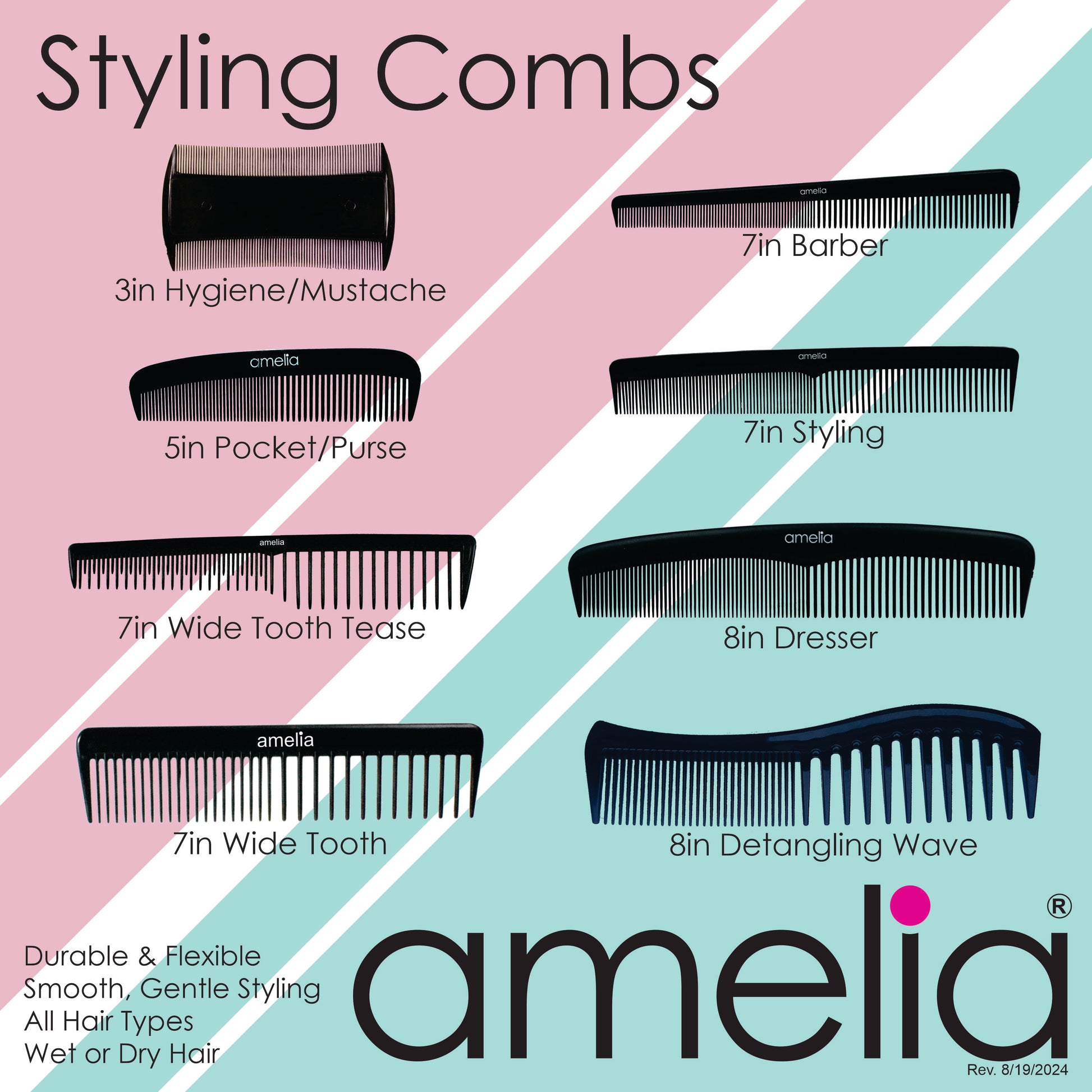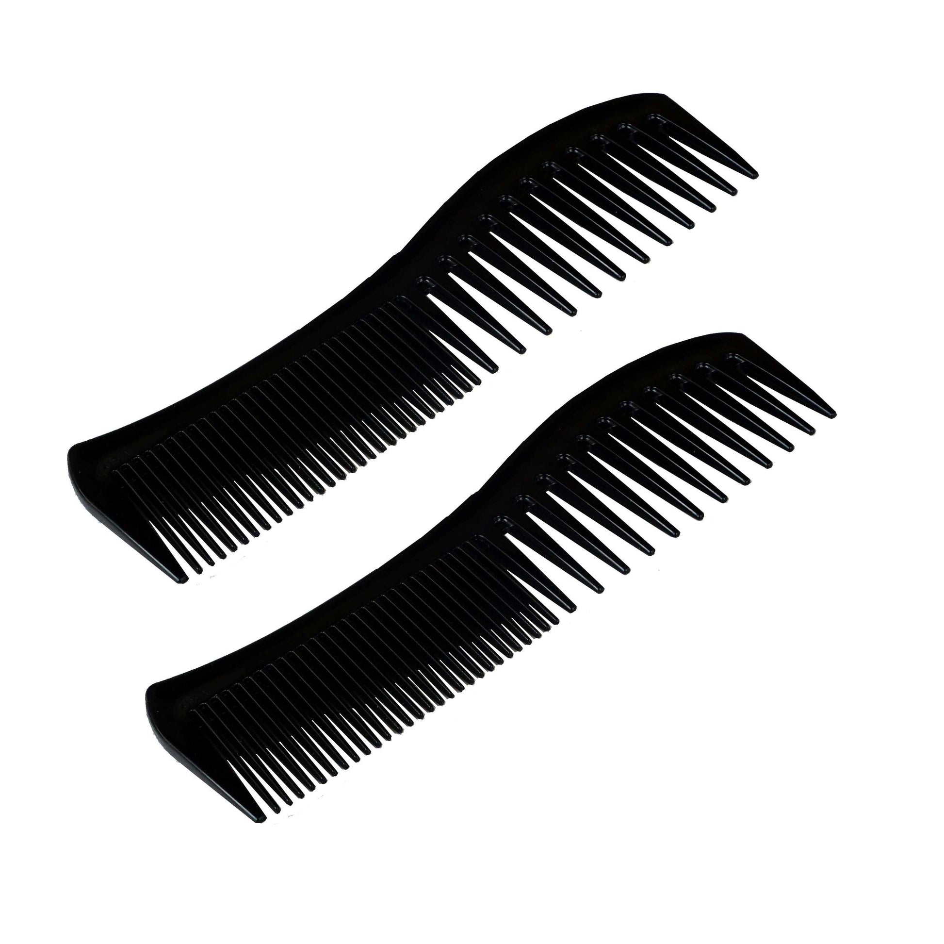 Amelia Beauty, 7.5" Black Plastic Detangling Wave Comb, Multi Pack of 2 Combs. Made in USA. Professional Grade Black Plastic Comb For All Hair Types and Ages. Smooth and Comfortable Seamless Design is Gentile on Hair and Does Pull or Damage Hair. Ideal for Combing Thick, Long Hair. Use on dry hair to softly tease out curls for a perfectly waved look, or apply gently to wet hair to smooth out stubborn tangles. Wet or Dry Use, Portable Everyday Wave Comb, Salon Barber Shop Black Rake Hair Styling Tool. Dimensions 7.5" x 2" with Extra Course Tooth Comb. Peine de plástico para el cabello