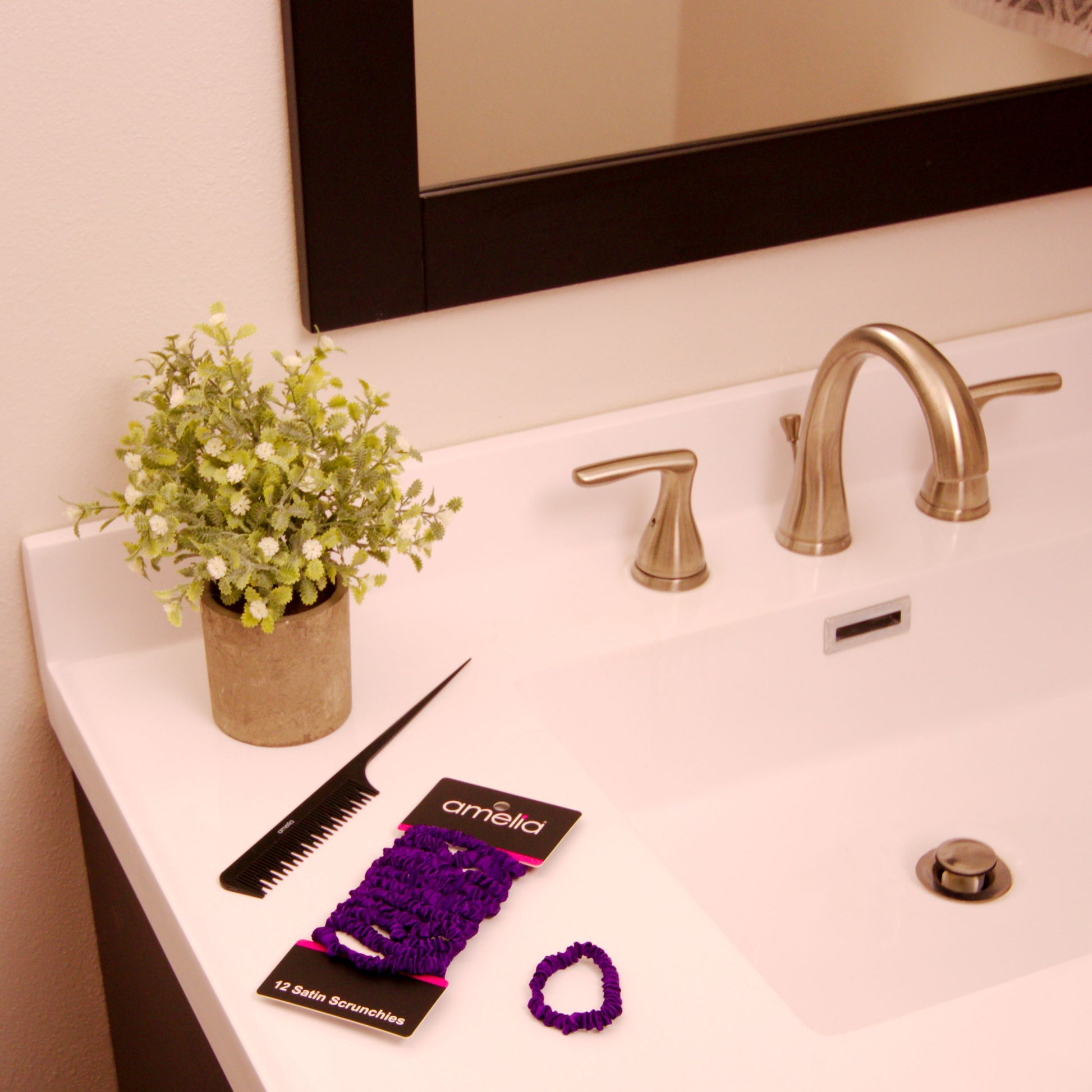 Amelia Beauty, 12 pack, 2in diameter x .25in thick, Purple satin skinny scrunchies for hair. These small-but-mighty scrunchies are smooth, soft, durable, and comfortable to wear all day with a no-snag, wrinkle-free design that's gentle on hair. Their strong elastic core makes them the perfect solution for any hairstyle. Don't let their small size fool you - they add a bold pop of color to your style, ideal for any occasion. The satin fabric minimizes frizz, reduces pressure, and even helps with hair headaches. Perfect for everyone and all hair types and lengths. Get yours today!